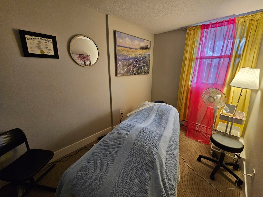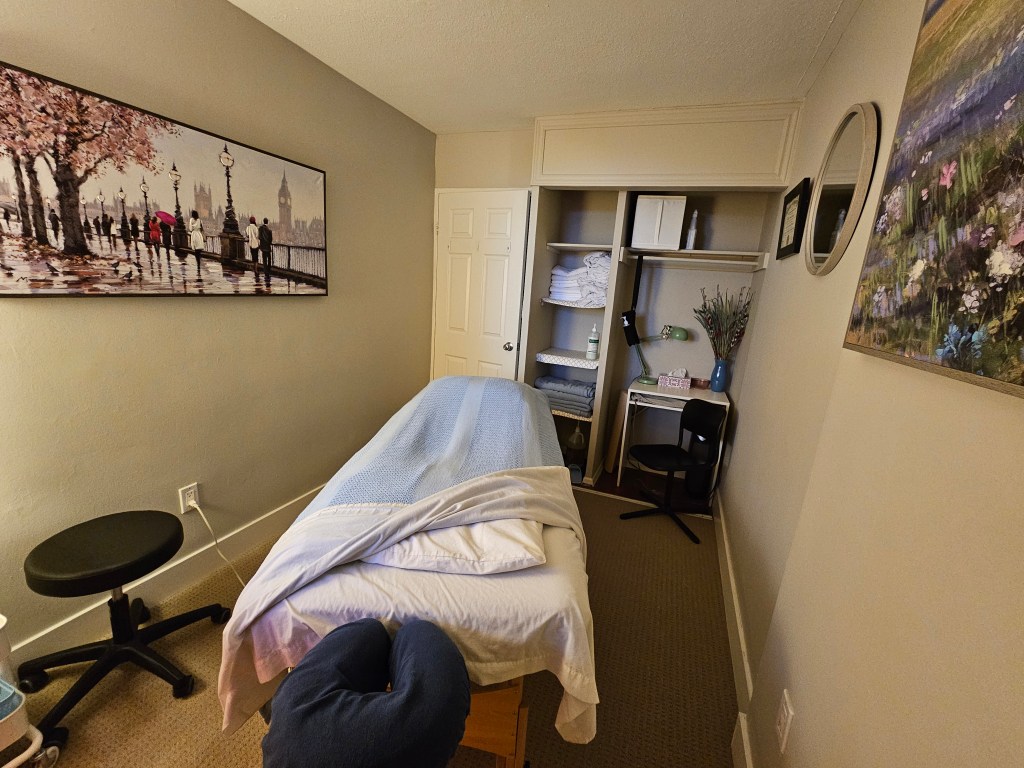 This is a home-based RMT practice. The space is clean and warmly lit. The table is cushioned, fleece-lined, and topped with a soft, wipeable cover. The disinfectant used is Health Canada-approved for coronaviruses. I use premium massage products: fractionated coconut oil on the body and peppermint & lemon peel cream for feet.
