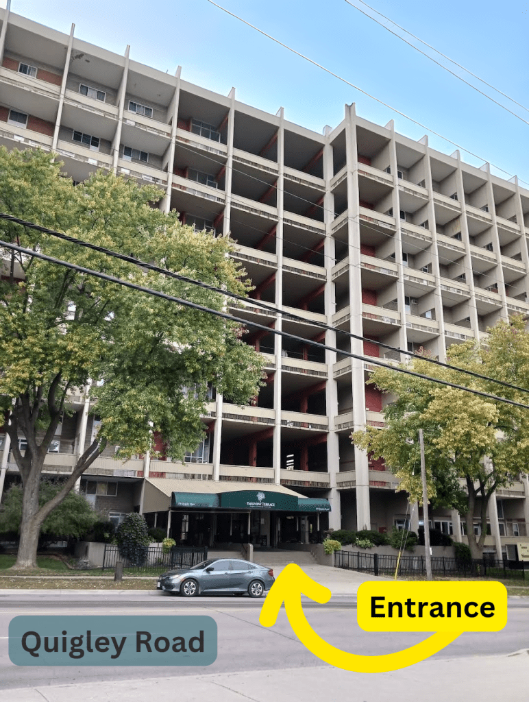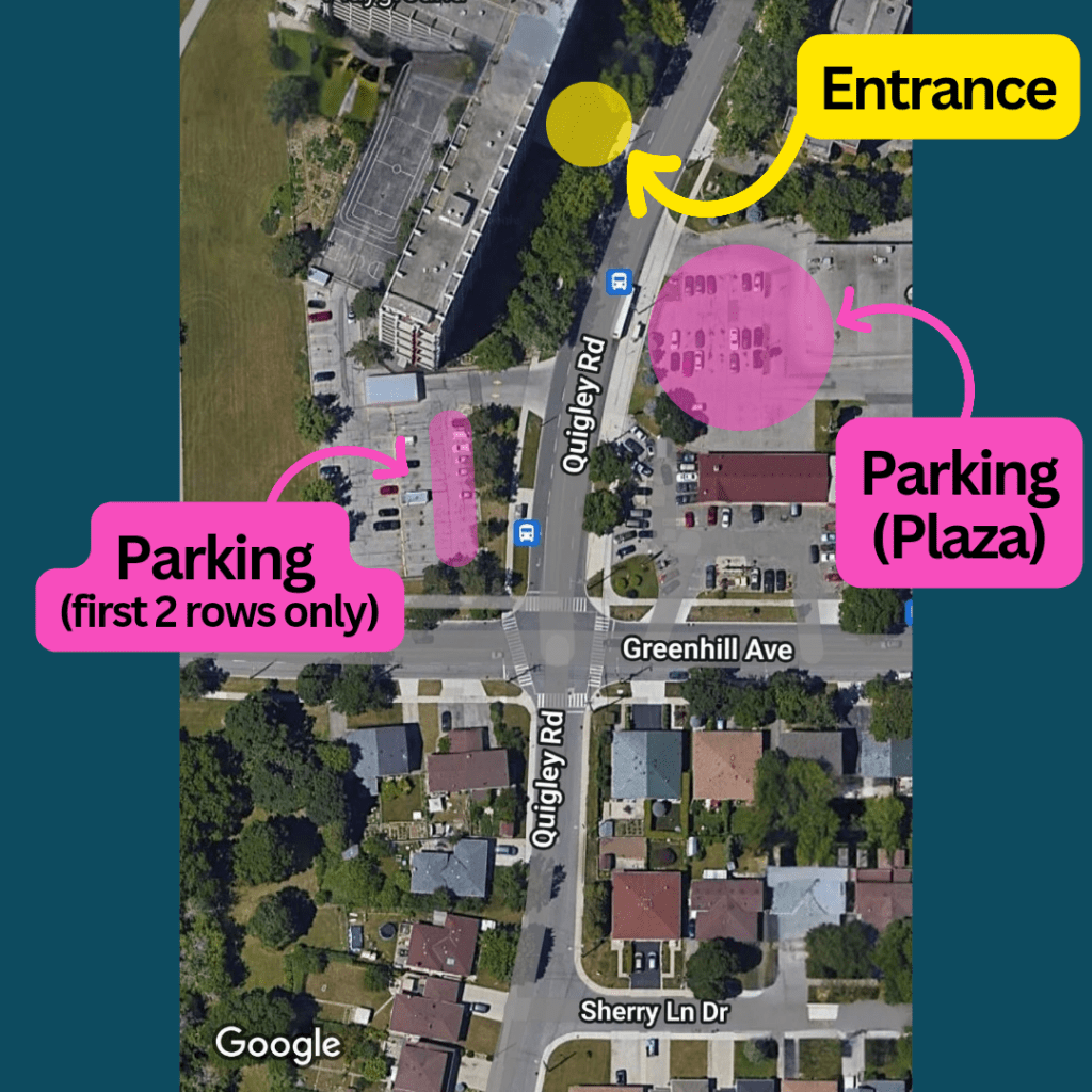Parking is off of Quigley. You may park in the plaza across the street or at 350 Quigley visitor parking (only the two rows of parking spaces closest to Quigley Road, or your car could get ticketed or towed). If you are unsure, it is best to park in the plaza for your first visit.